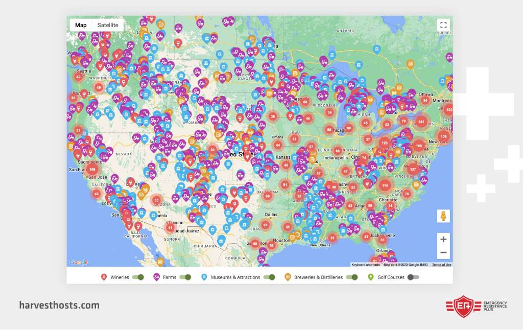As we mentioned earlier, more and more wineries are offering camping at their properties, and you have tons of options across the country. To get a sense of the scale, check out this map from Harvest Hosts of more than 4,500 wineries in their network: